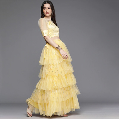 Beige woven design unstitched blouse, has a round neck, short sleeves, beige woven design semi-stitched lehenga, has drawstring closure, flared hem