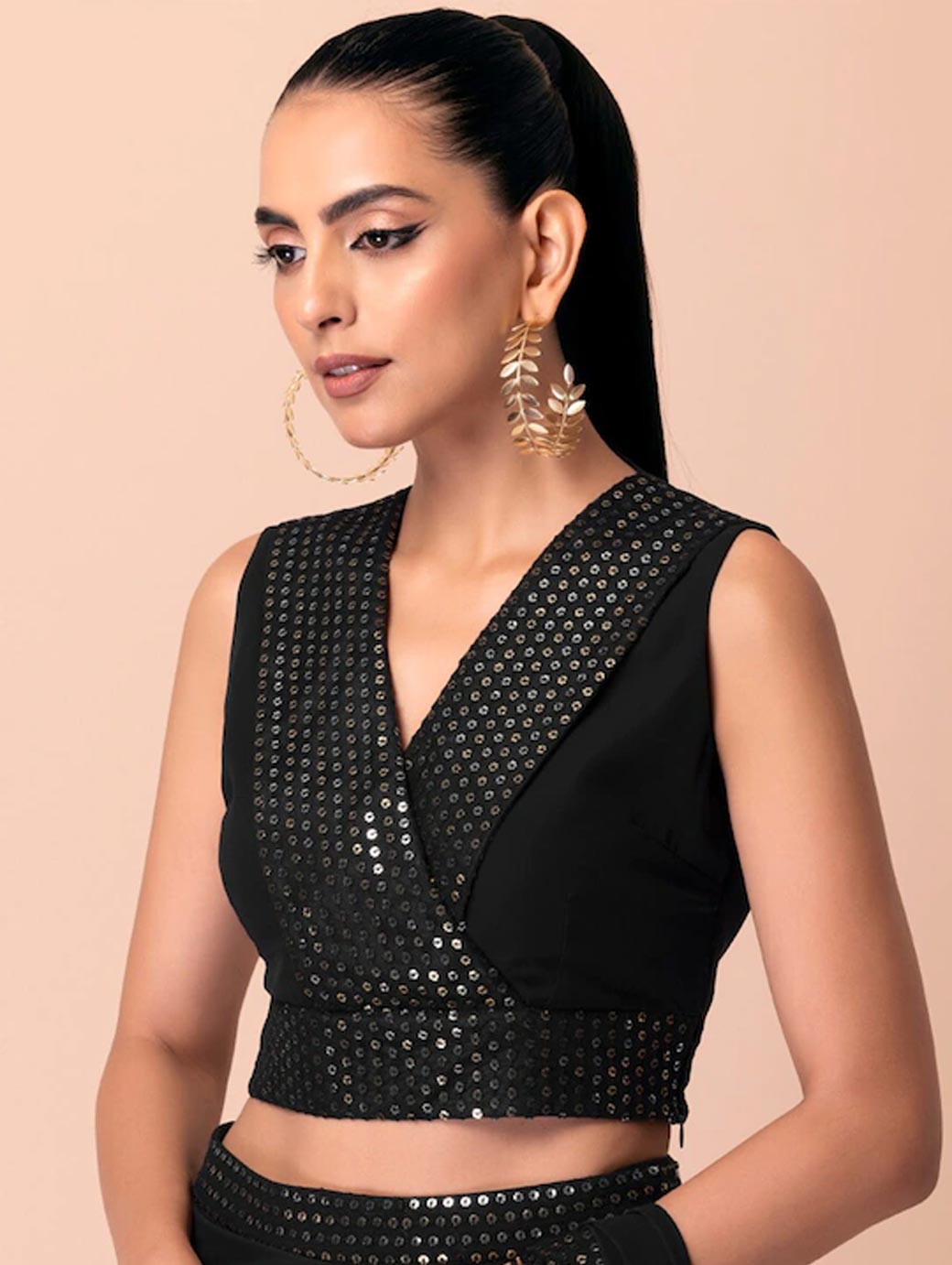 Black crop wrap ethnic top Embellished V-neck, sleeveless, no sleeves Sequined detail Woven.