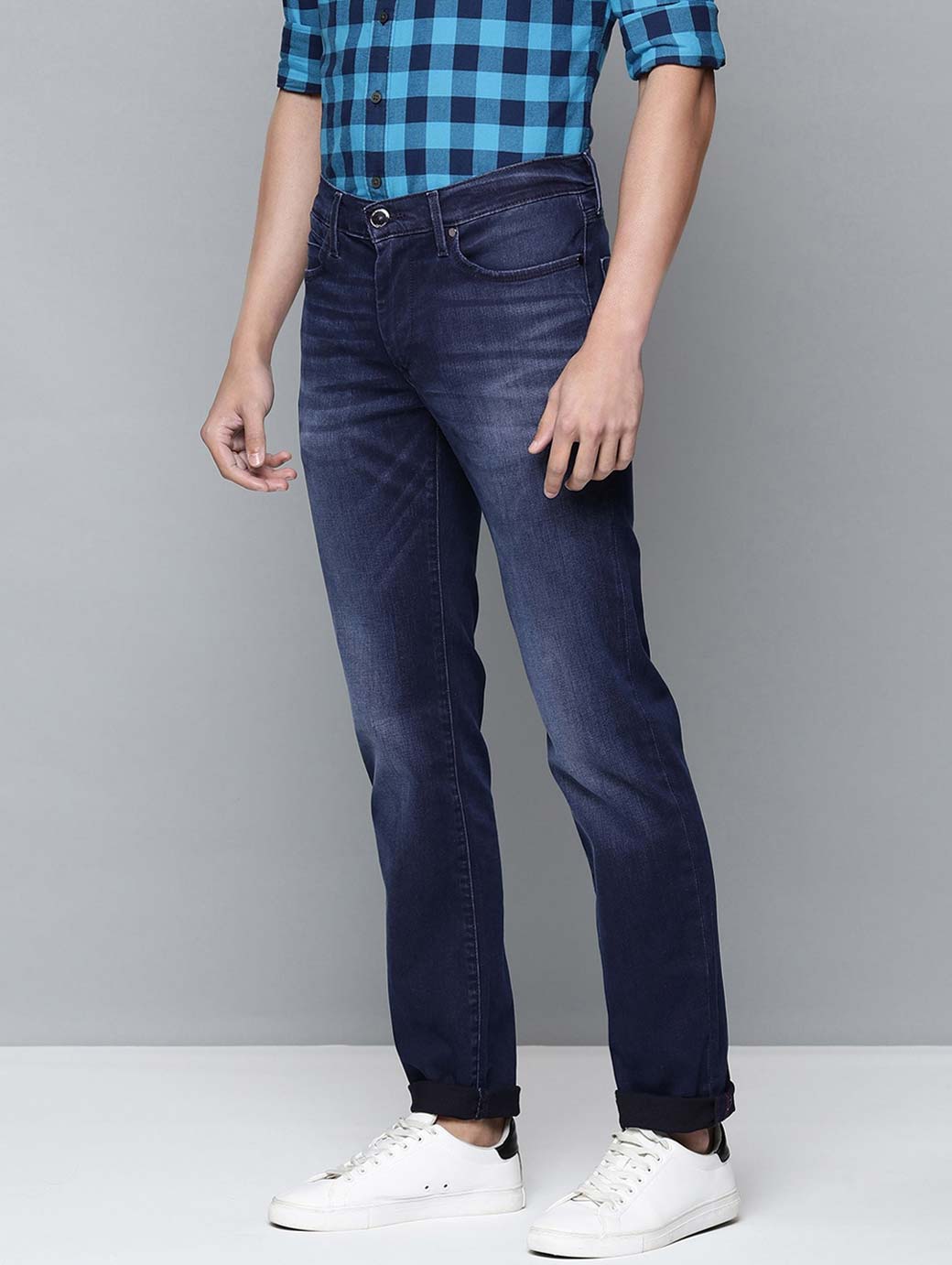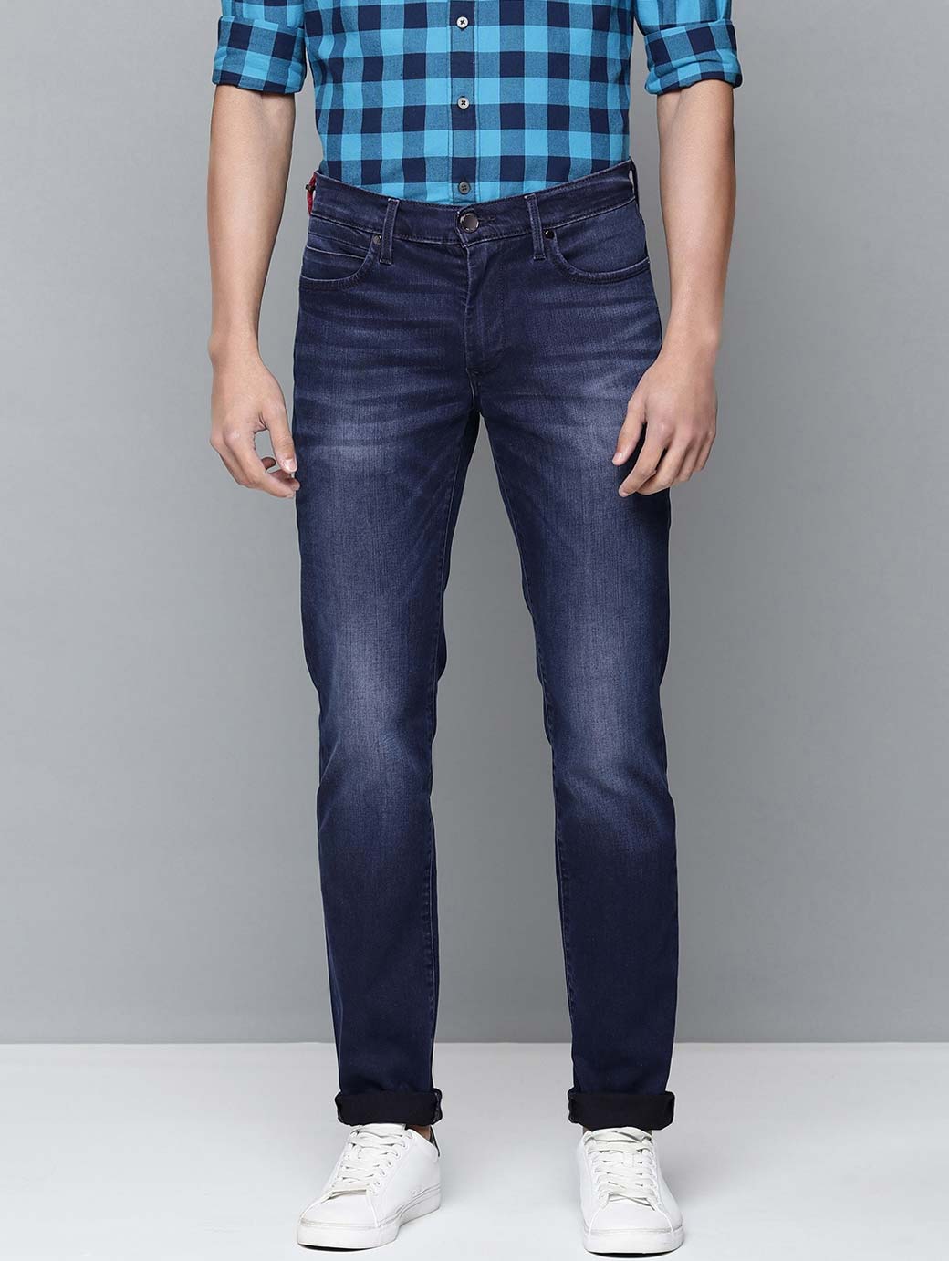 • Medium shade, light fade blue jeans