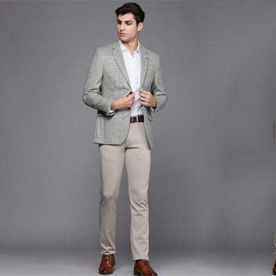 Grey Checked tailored tweeds blazer, has a notched lapel, long sleeves, single-breasted with a double button closure, 2 pockets, an attached lining and a double-vented back hem