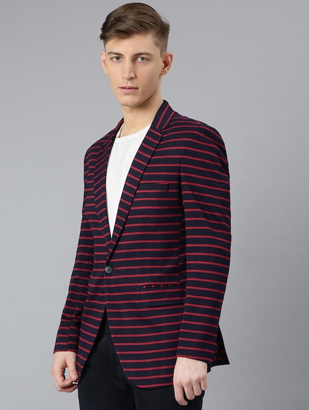 Navy blue & Red Striped regular-fit casual blazer, has a notched lapel, long sleeves, single-breasted with double button closure, two flap pockets, one welt pocket and a double-vented back hem