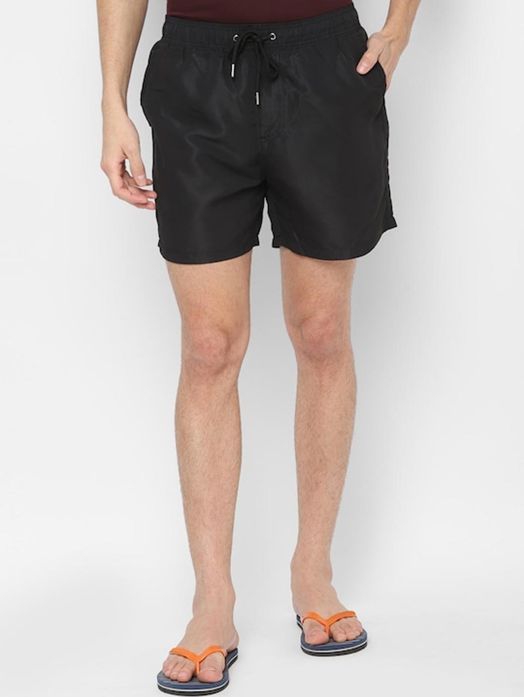 Navy blue solid swim shorts, has an elasticated waistband with drawstring closure and 2 pockets