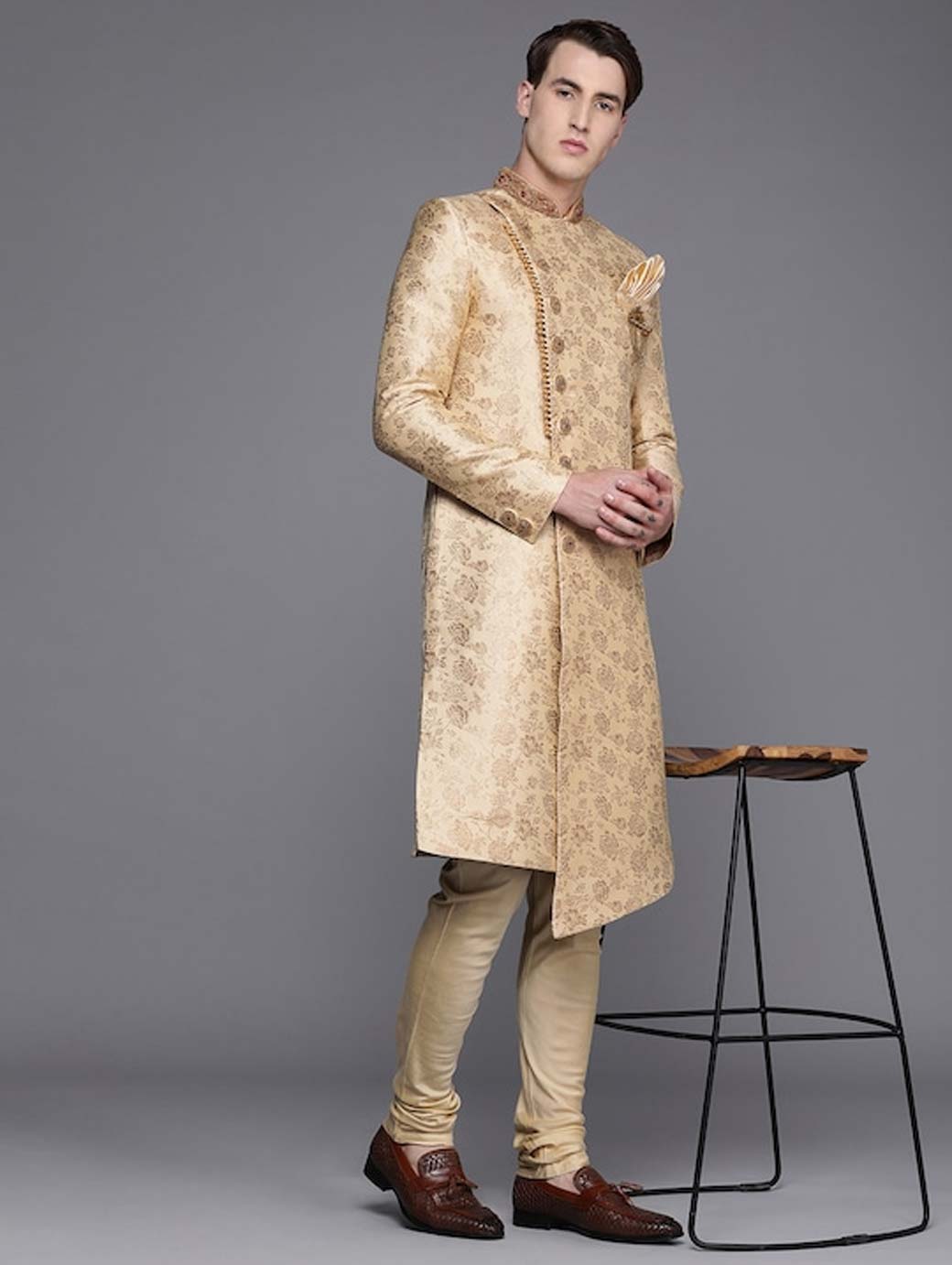 Men Ethnic Motifs Printed Raw Silk Kurta with Pyjamas & Nehru Jacket