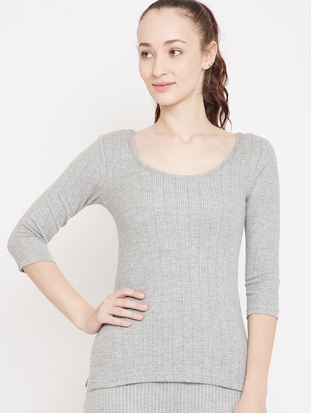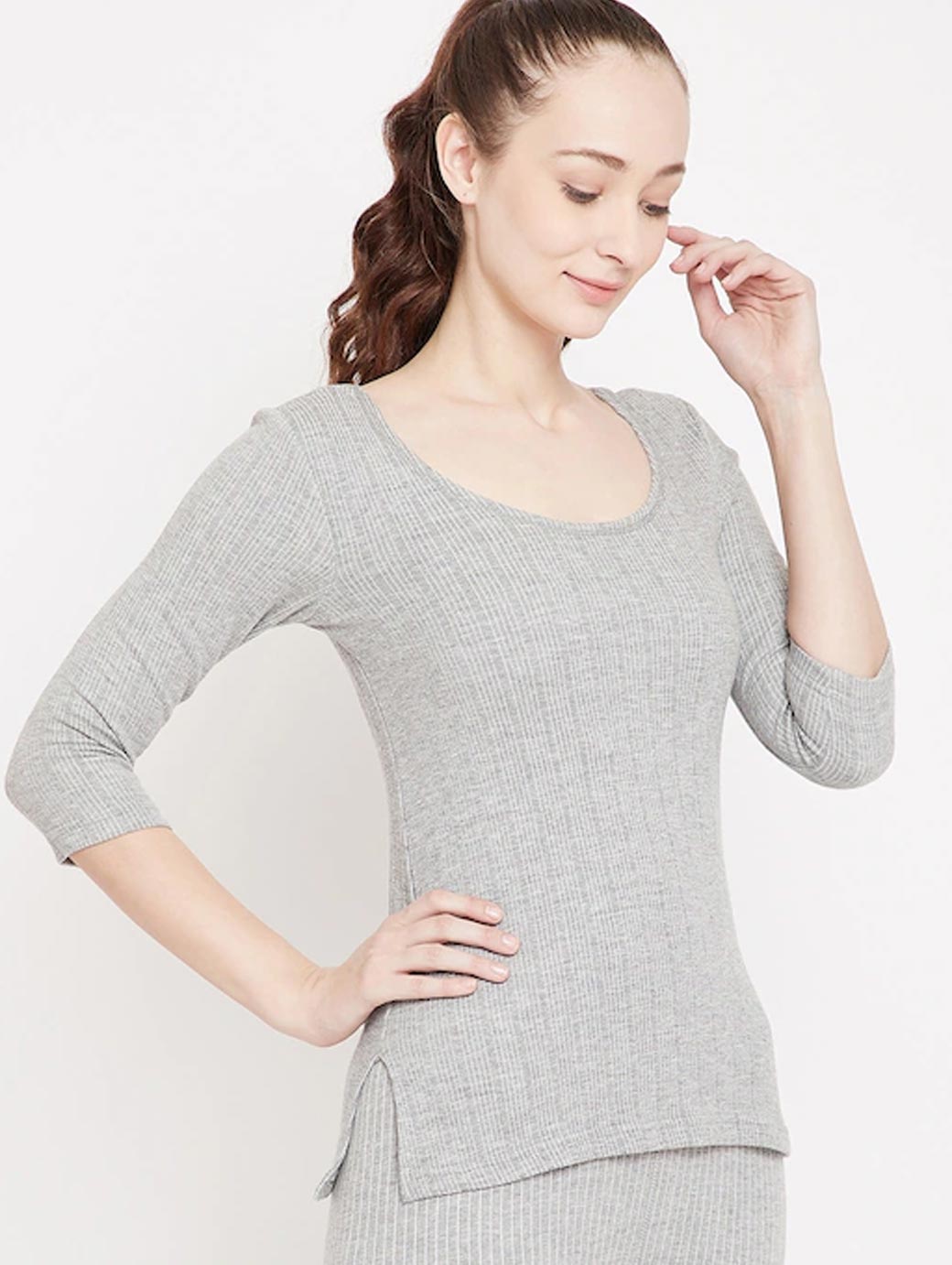 Grey melange striped thermal top, has a round neck, three-quarter sleeves, side slits