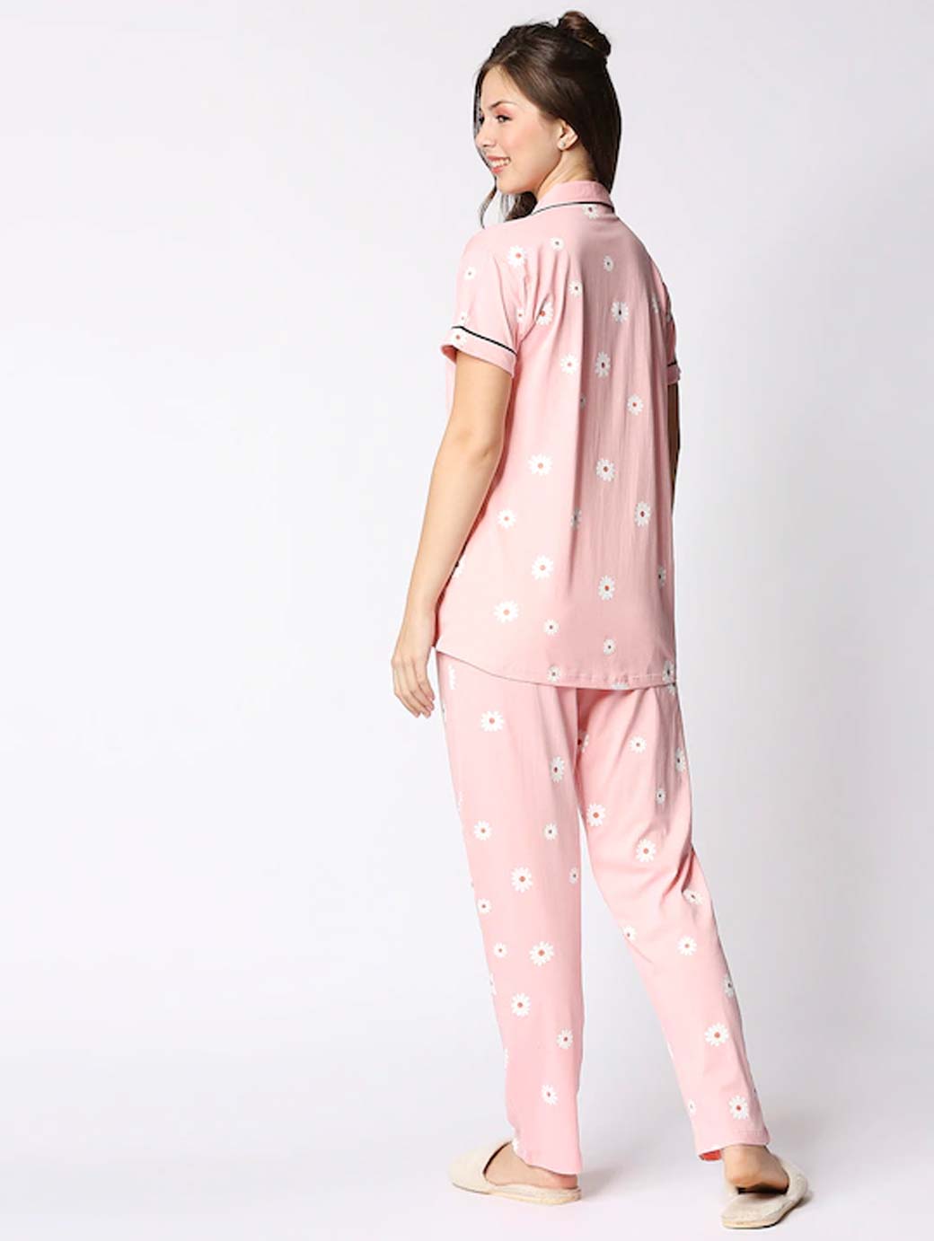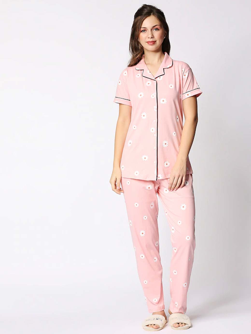 Peach night suit consists of T-shirt and pyjamas Peach printed T-shirt, has a lapel collar, short sleeves Peach Printed pyjamas, has drawstring closure, one pocket