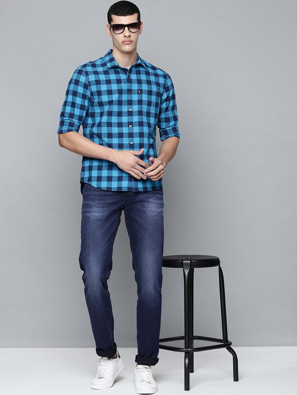 • Medium shade, light fade blue jeans