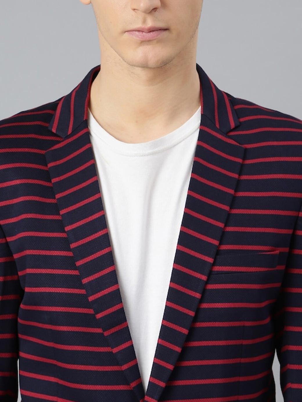 Navy blue & Red Striped regular-fit casual blazer, has a notched lapel, long sleeves, single-breasted with double button closure, two flap pockets, one welt pocket and a double-vented back hem