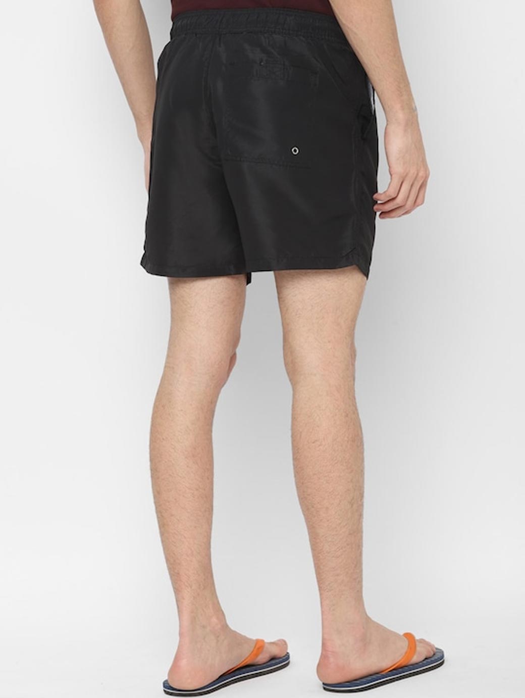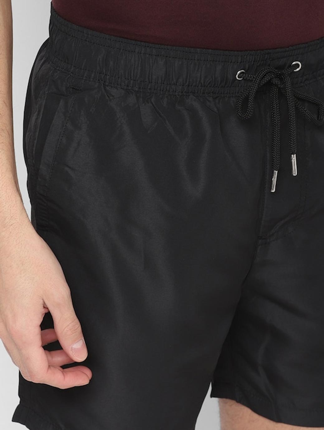 Navy blue solid swim shorts, has an elasticated waistband with drawstring closure and 2 pockets