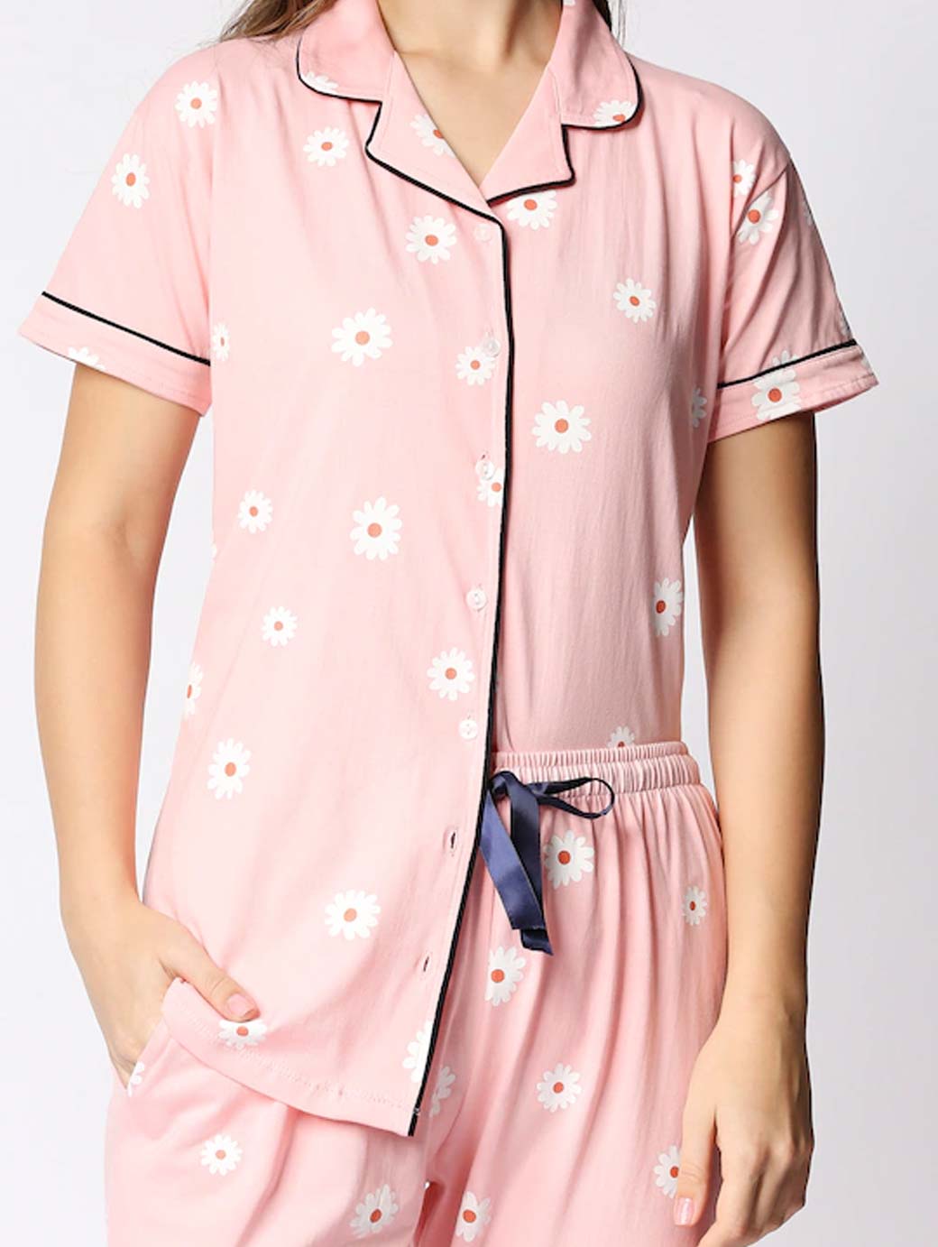 Peach night suit consists of T-shirt and pyjamas Peach printed T-shirt, has a lapel collar, short sleeves Peach Printed pyjamas, has drawstring closure, one pocket